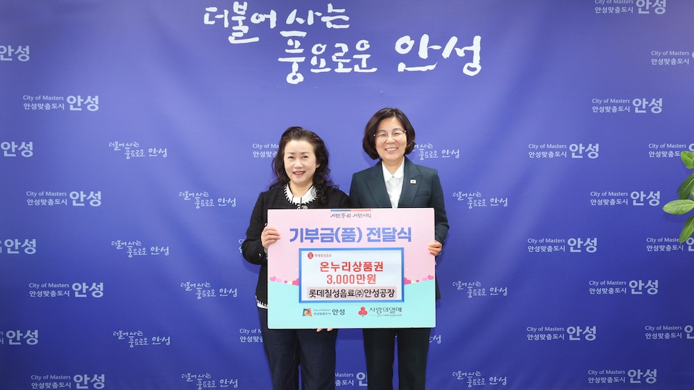 안성시(시장 김보라)는 지난 11월 24일 롯데칠성음료(주) 안성공장으로부터 지역사회 복지 향상과 전통시장 활성화를 위해 온누리상품권 3천만 원을 기부받았다고 밝혔다.
