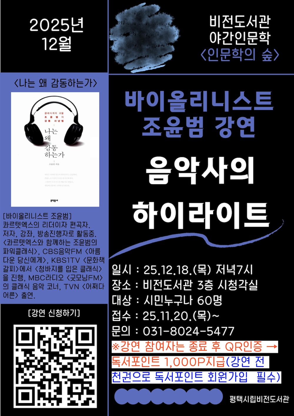평택시립 비전도서관이 오는 12월 18일 저녁 7시 조윤범 바이올리니스트를 초청하여 ‘음악사의 하이라이트’를 주제로 야간 인문학 강연을 진행한다.