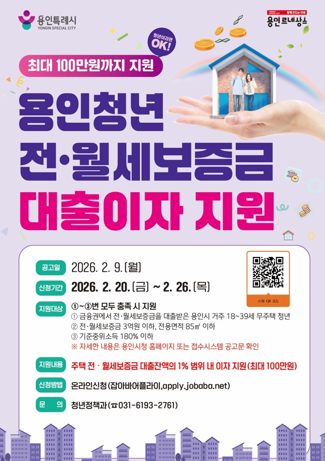 용인특례시(시장 이상일)는 청년층의 주거비 부담을 덜고자 전월세 보증금 대출이자를 지원한다고 6일 밝혔다.
