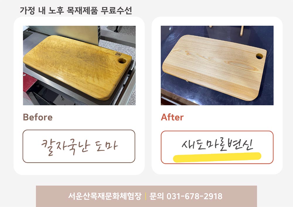 무료 수선 서비스는 오는 11월까지 매주 금・토・일요일에 운영된다. 대상 품목은 가정에서 사용하는 도마, 의자, 소형 가구 등 생활 목재제품이다. 뒤틀림이나 흔들림 보정, 표면 마감 보수 등 비교적 간단한 수선을 중심으로 진행되며, 제품 상태에 따라 수선이 어려울 경우 서비스가 제한될 수 있다.