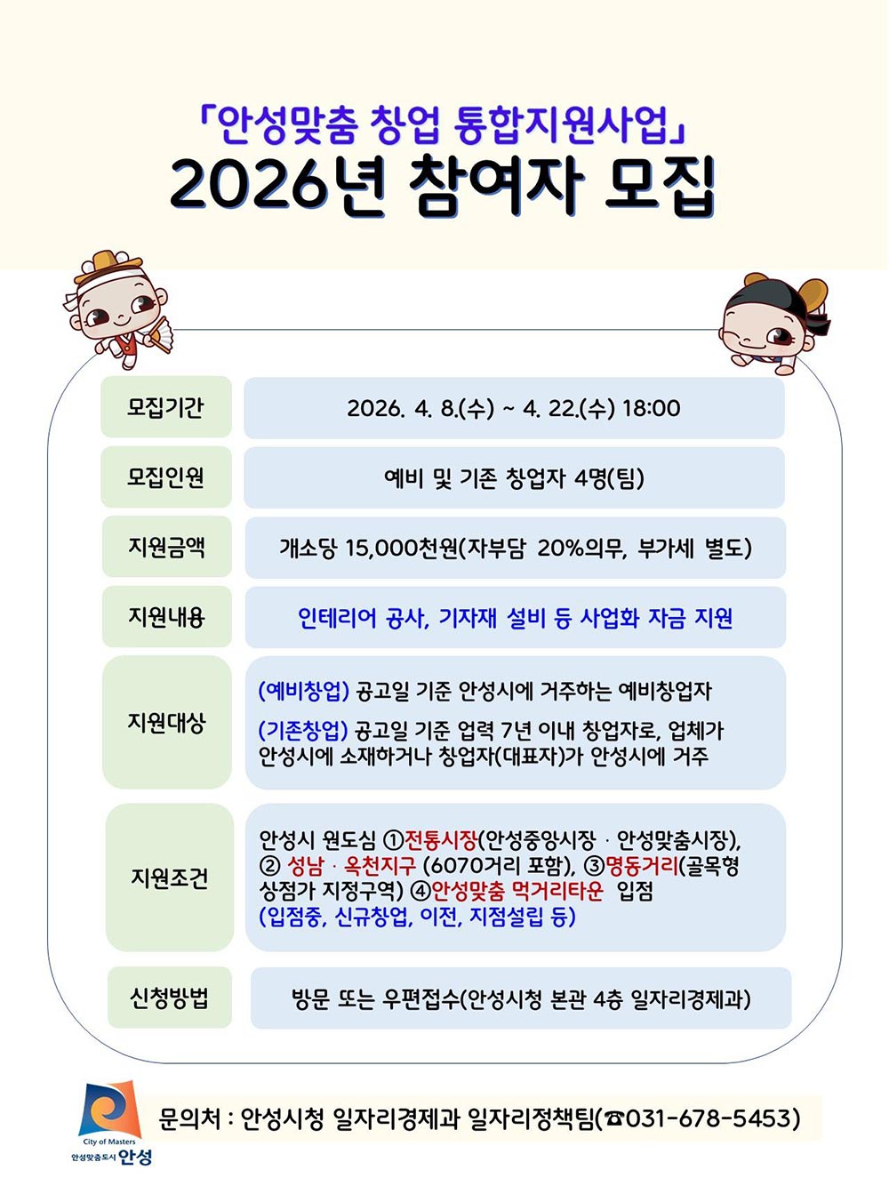 안성시는 오는 4월 8일부터 22일까지 ‘2026년 안성맞춤 창업 통합지원사업’ 참여자를 모집한다고 밝혔다. 이번 사업은 전통시장과 골목상권에 창업을 유도해 지역 상권을 활성화하고, 이를 차세대 문화・관광 자원으로 발전시키기 위해 마련됐다.