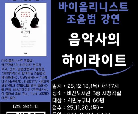 비전도서관, 12월 야간 인문학 강좌 바이올리니스트 조윤범 초청 강연 평택시립 비전도서관이 오는 12월 18일 저녁 7시 조윤범 바이올리니스트를 초청하여 ‘음악사의 하이라이트’를 주제로 야간 인문학 ...
