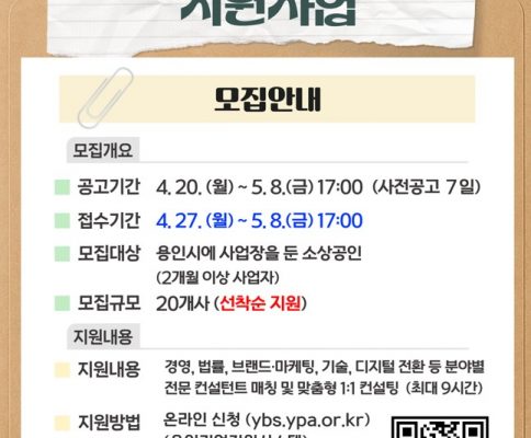 – 4월 27일~5월 8일 용인시 기업지원시스템 홈페이지서 온라인 신청 – – 노무?세무?법률, 마케팅, 경영 온라인화 등 분야 컨설팅 9시간